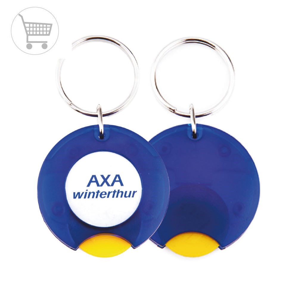 Um porta-chaves publicitário moderno, colorido e muito prático com moedas para carrinhos de compras.Escolha o seu desenho ou fotografia e faça o seu porta-chaves num instante.O seu design arredondado com moedas de carrinho de plástico numa cor diferente das restantes, torna-o um artigo promocional que transmite uma imagem de marca dinâmica e inovadora.Com 1 face (Ø25mm) para inserção de papel e fecha com uma tampa em acrílico.