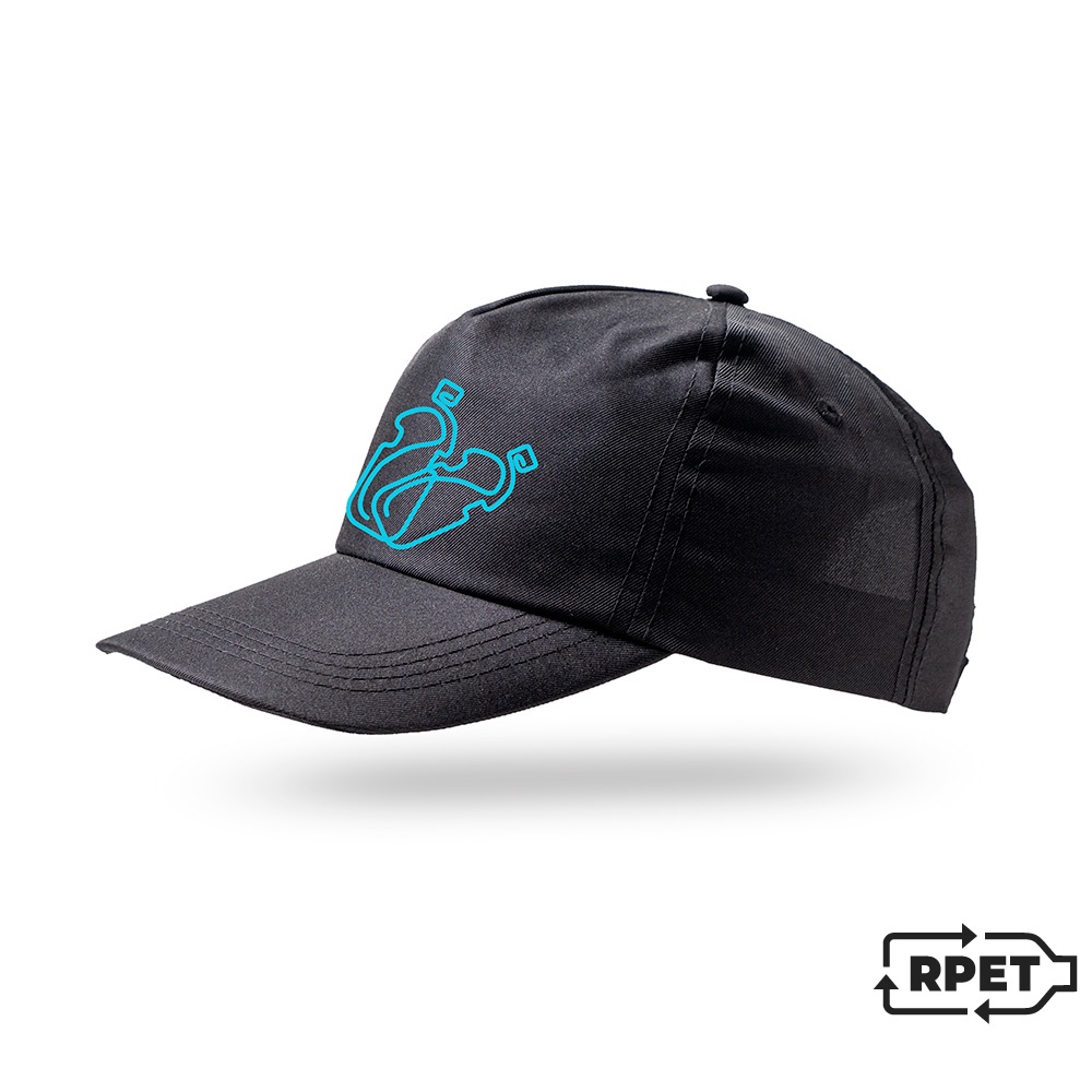 O boné promocional e ecológico, em RPET, para adulto. 5 Painéis. Fecho em velcro e etiqueta “RPET”.