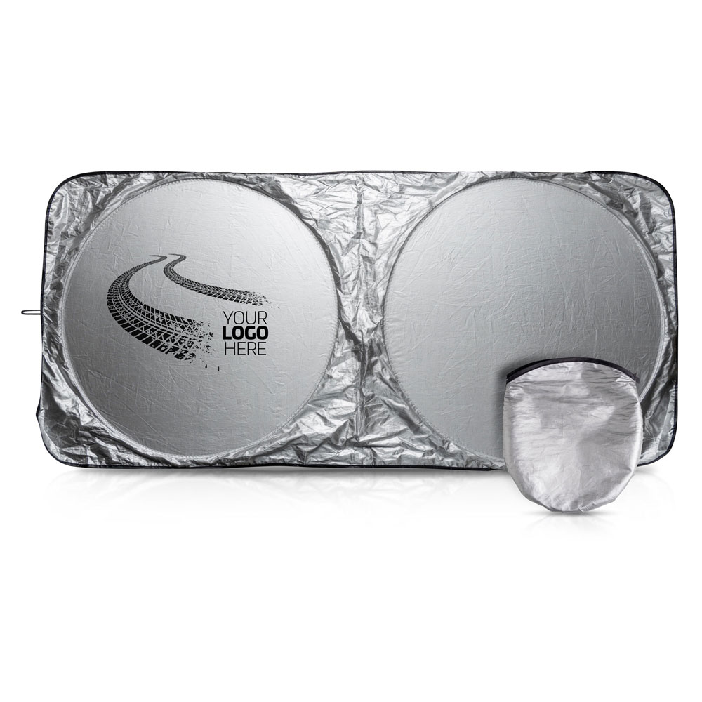 Pára-sol dobrável em poliéster com bolsa. Para que o seu carro não sofra danos causados pelo sol, proteja o interior com o pára-sol dobrável que vem com elástico e bolsa para facilitar o uso e a arrumação. Este pára-sol é adequado para o vidro fontal. As suas medidas são de 150.00 x 70.00 cm.